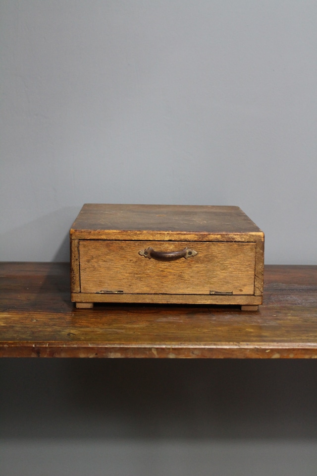 【古道具:商品特徴】 使い込まれた木の風合いが美しい、古い小さな引き出し箱。 長い時間を経てきた擦れや色味が、落ち着いた雰囲気をまとわせています。 引き出し部分は浅めで、 文具や小物、アクセサリーの定位置にぴったり。 ちょこんと置くだけで空気が変わる、存在感のある古道具です。 店舗のカウンターや玄関、デスク周りなど、 どこに置いても馴染みやすいサイズと佇まい。 上に小物を重ねてディスプレイしても素敵です。 一点ものになります。 ▷サイズは画像9枚目、10枚目でご確認ください 【注意事項/お取扱について】は ネットショップの一番上にあります 【古道具について】を必ず一読ください。 ////////// こちらは古道具です。 経年による欠け・汚れ・キズ等がございます。 古道具の特性をご理解いただいた上でご購入をお願いいたします。 梱包は環境に配慮し、使い古した段ボールや紙袋を使用する場合がございます。 気になる点がございましたら、必ずご購入前にお問い合わせください。 ※返品・交換はできませんのでご了承ください。