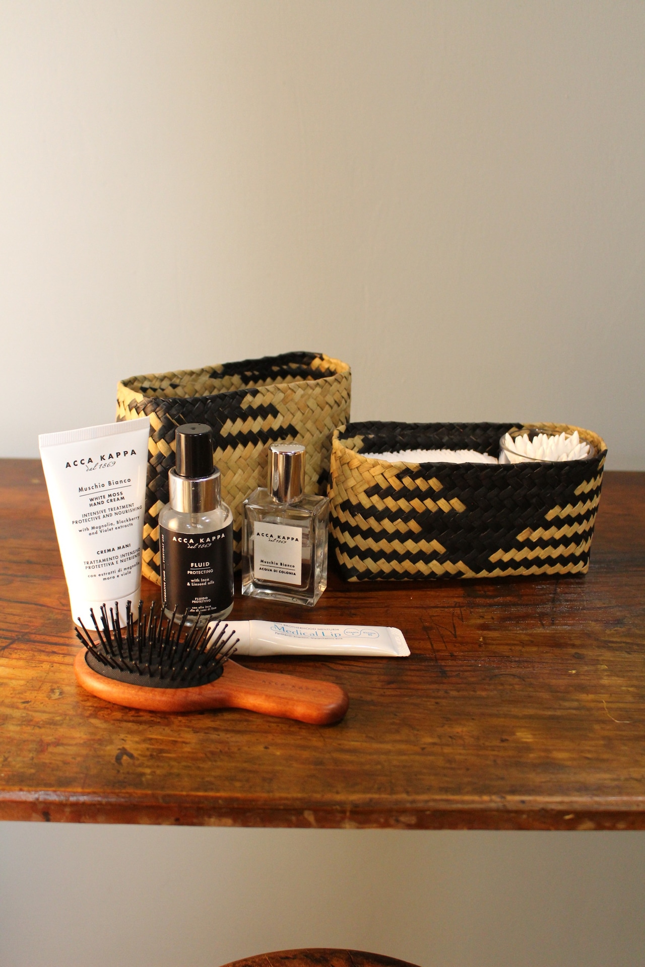 コットンや綿棒、ヘアブラシなどのケア用品をまとめたり、