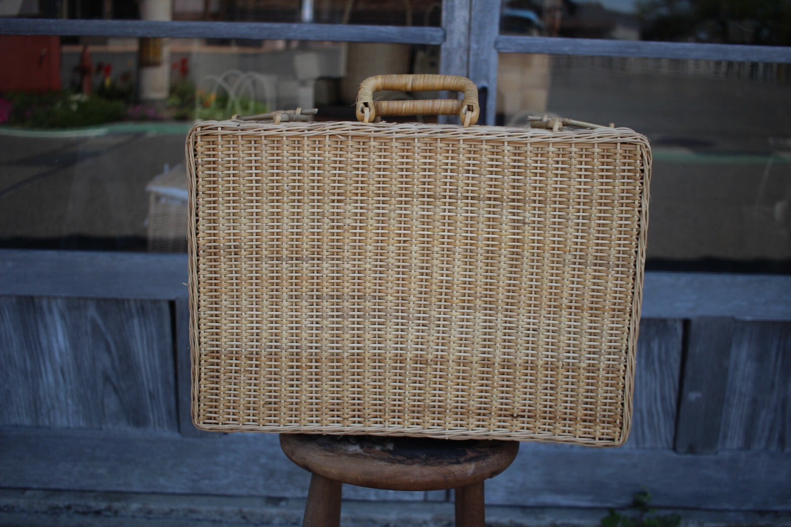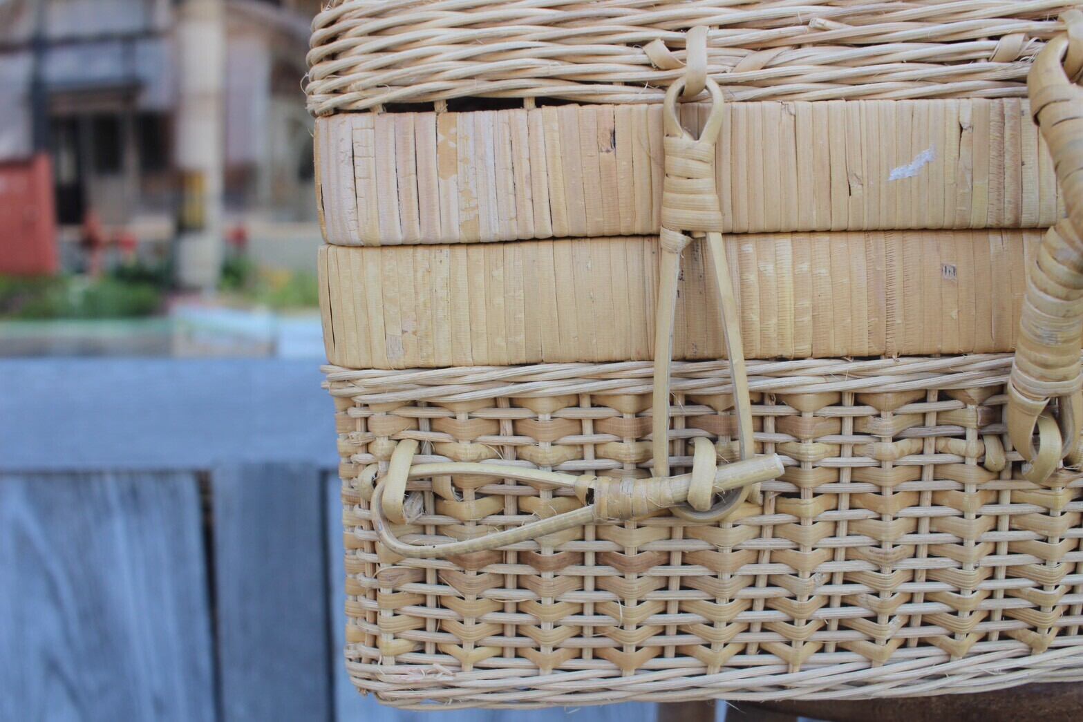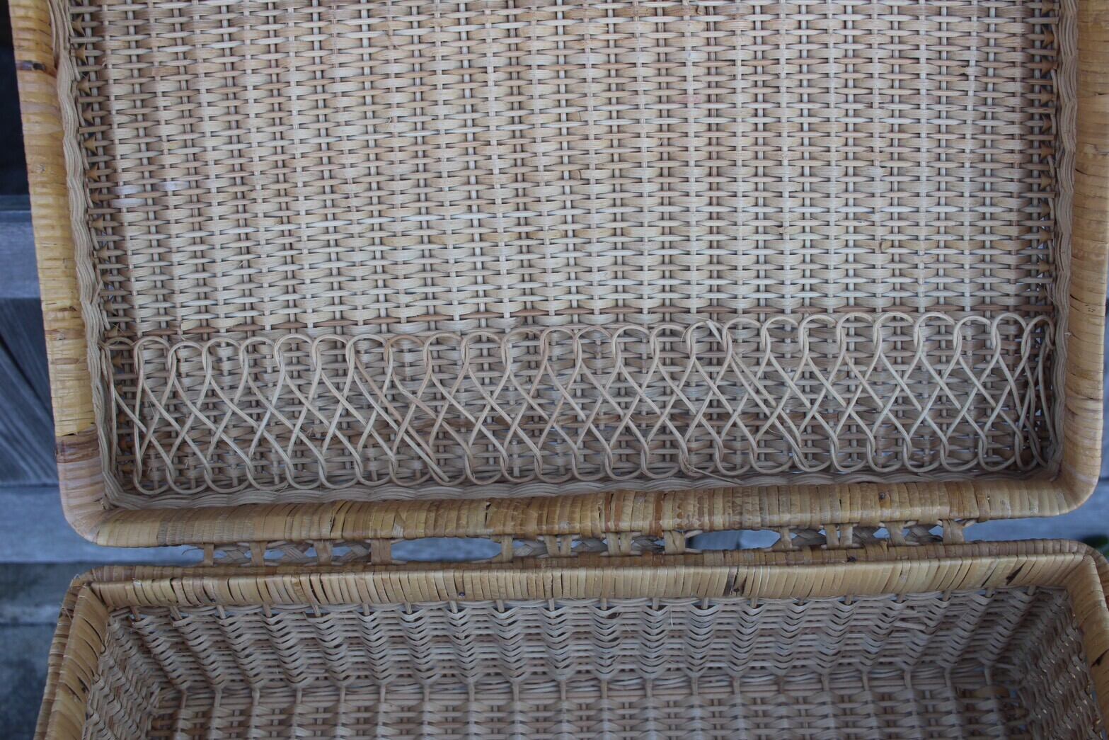 すっきりとした長方形のフォルムが美しい、ふた付きのかごバッグ。